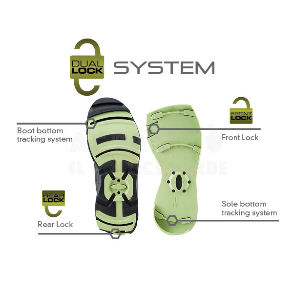 in qualsiasi tipo di ambiente terrestre o acquatico. Il sistema a doppio blocco mantiene la suola saldamente al suo posto. Una volta montata la suola non può essere rimossa se non sbloccando